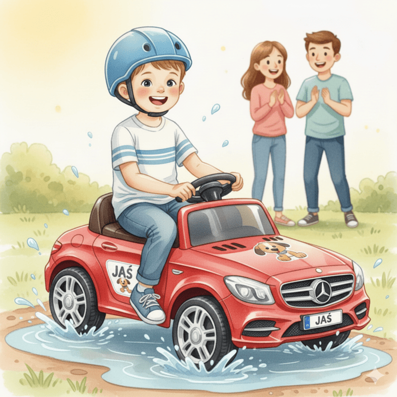 W końcu, z głośnym "Hurra!", wjechał na szczyt pagórka! Widok z góry był wspaniały. Przed nim rozciągała się kałuża! "Błoto!" – zawołał, ale nie było w tym strachu, tylko ekscytacja. Jego Jeździk Mercedes dla małych odkrywców był przecież na wszystko przygotowany! Ostrożnie przejechał przez wodę, a autko na cichych, gumowych kołach pokazało, że radzi sobie nawet w trudnym, „błotnistym” terenie. Mama, która obserwowała jego zmagania, podeszła, klaszcząc. "Brawo, Jasiu! Jaka wspaniała i bezpieczna zabawa na świeżym powietrzu! Cieszę się, że masz tak niezawodny jeździk, który wspiera rozwój motoryczny." Jaś czuł się jak prawdziwy, nieustraszony rajdowiec. Wiedział, że jego jeździk Mercedes to najlepszy towarzysz wszystkich jego wspaniałych przygód. Czekał już na kolejne wyzwania! (Następnym razem spróbuje dotrzeć na koniec ogrodu!)