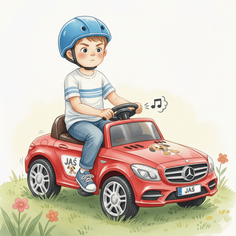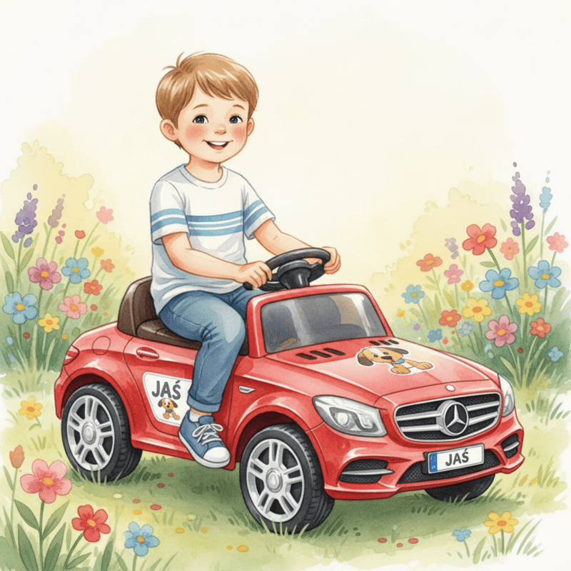 Jaś, lat pięć, uwielbiał swój czerwony jeździk. To nie był zwykły jeździk, ale prawdziwy jeździk Mercedes dla małych odkrywców! Wyglądał jak miniatura sportowego samochodu, lśniący w słońcu, a na jego boku widniały spersonalizowane naklejki – jego imię i uśmiechnięty piesek. Ten pojazd był z Jasiem od dawna; to był idealny prezent na roczek, który towarzyszył mu przez całe dzieciństwo. Najpierw Jaś używał go jako pchacza, stawiając swoje pierwsze, niepewne kroki, a potem jako swój pierwszy rowerek dla dziecka 1-3 latka, choć teraz był już doświadczonym rajdowcem.